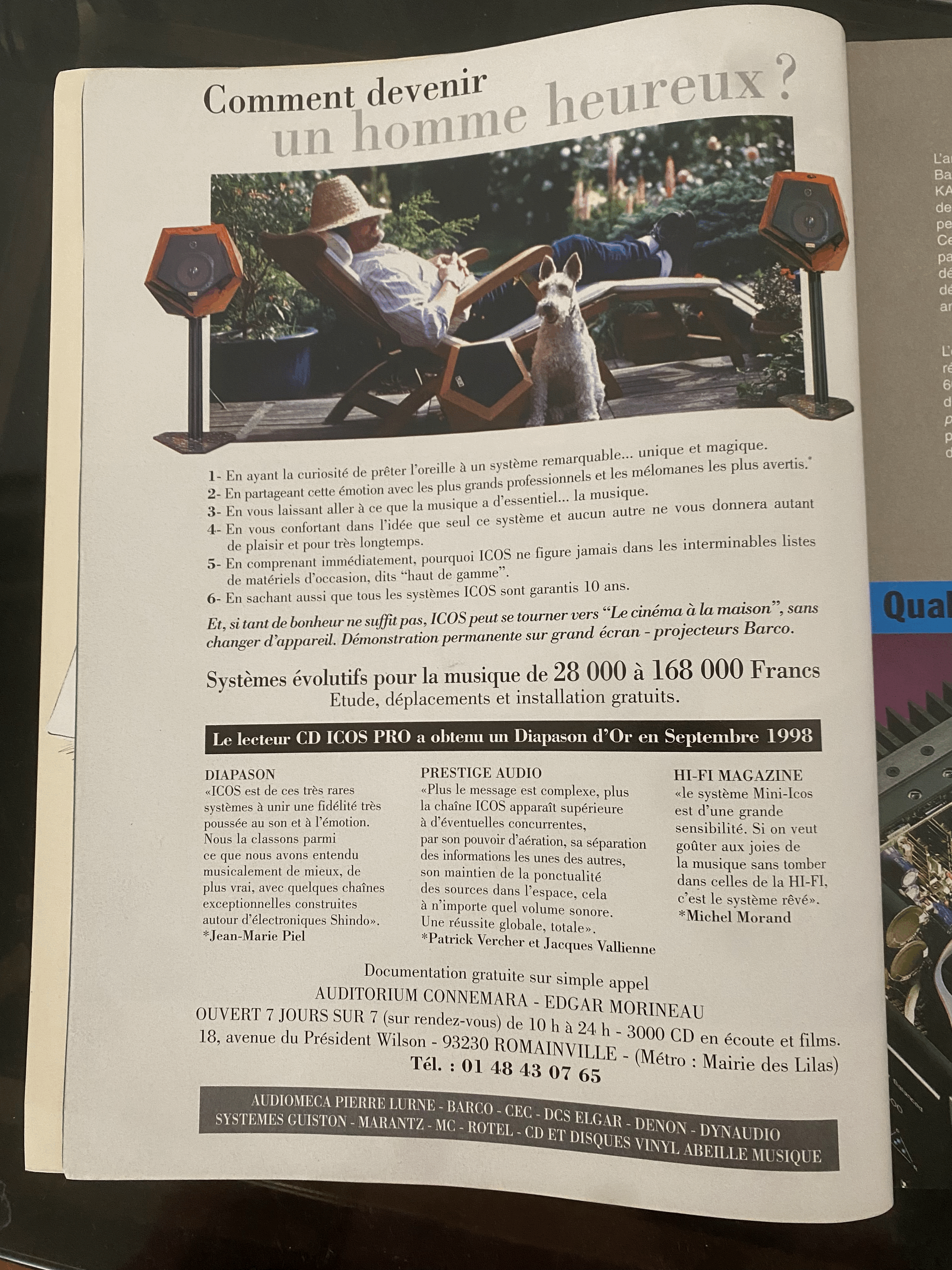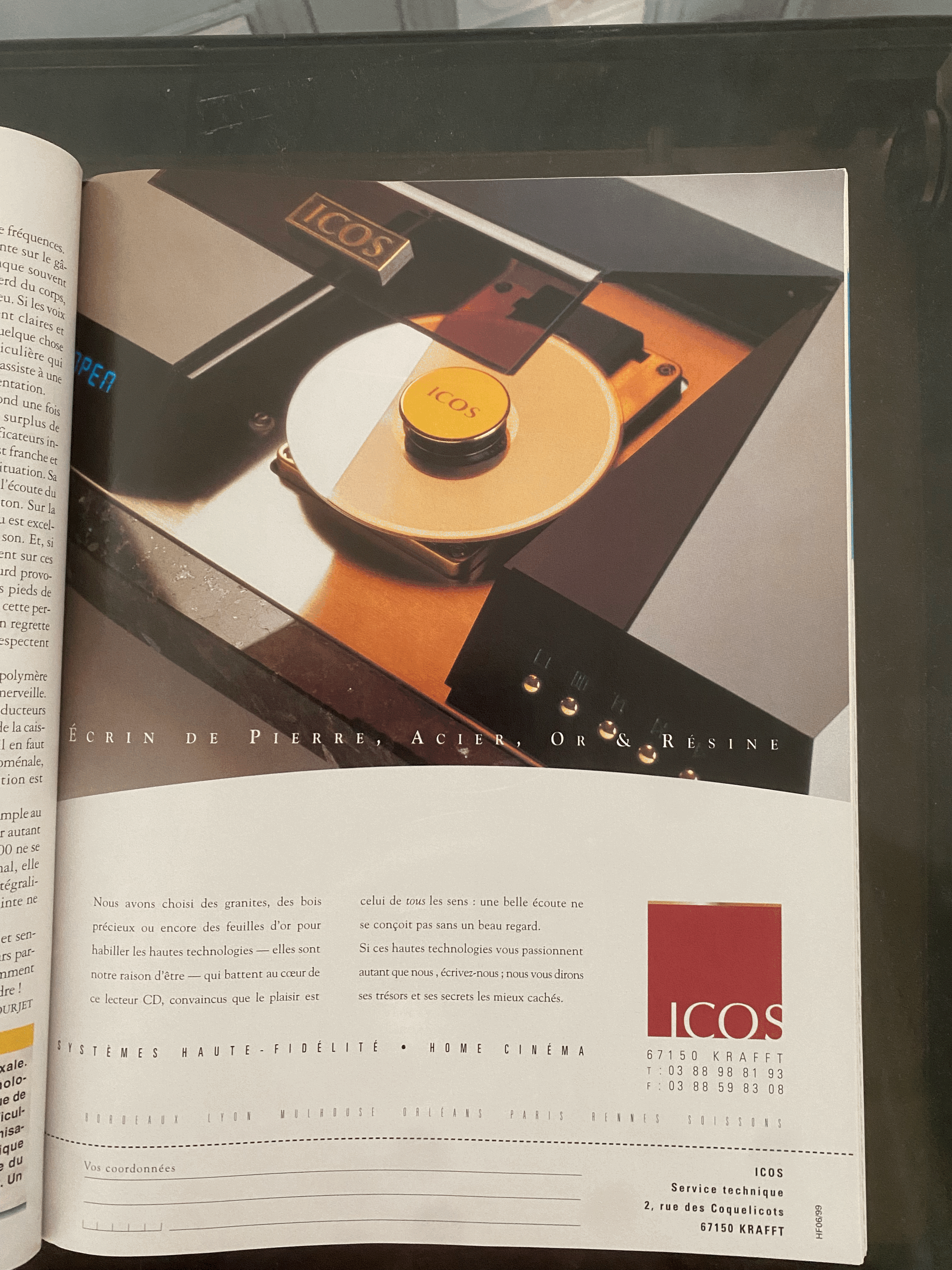 1998年底,他将其产品的生产和分销委托给ICOS公司。从那时起,公司推出了多款 CD 播放器,受到媒体的好评,还有一系列新的立体声电子产品以及一系列家庭影院设备。这些元素由采用最先进转换技术的各种型号的数模转换器补充。